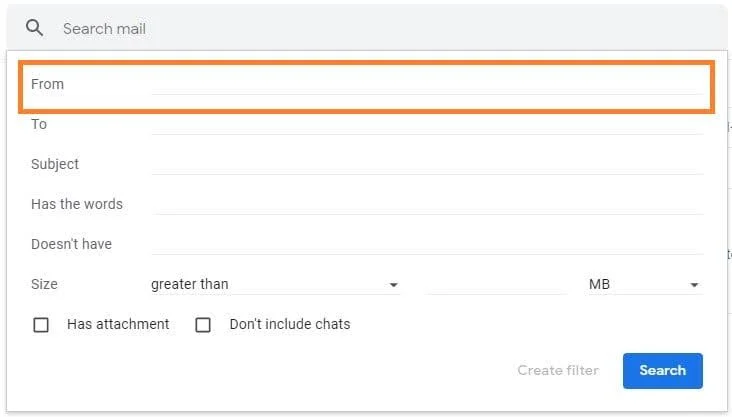 4. Add a specific email or a whole domain in the “From” field. The "From" field is where you'll specify what's getting whitelisted. In Gmail, you can specify either a specific email address (e.g. hello@domain.com), or you can whitelist a whole domain by omitting everything before the at symbol (e.g. @domain.com). In the case of Learn to Win, add "@learntowin.com"