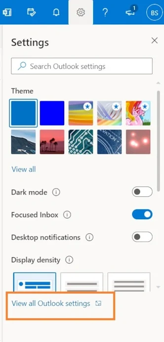 1. Click the gear icon in Outlook and select “View all outlook settings.” When you select the gear icon, a drop-down menu will appear. At the bottom of the drop-down menu, you’ll choose View all Outlook settings.