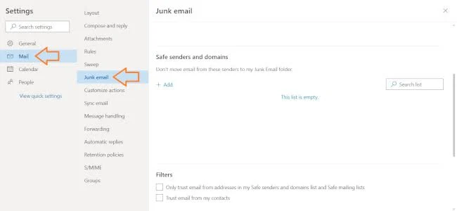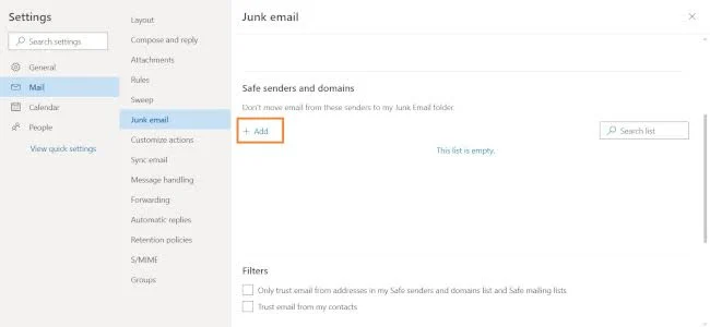 2. Select Filters and hit Add new filters to enter information about the domain name or sender.