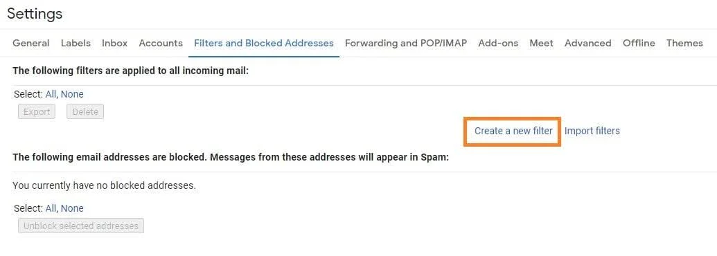 2. Navigate to “Filters and Blocked Addresses” in the top menu.