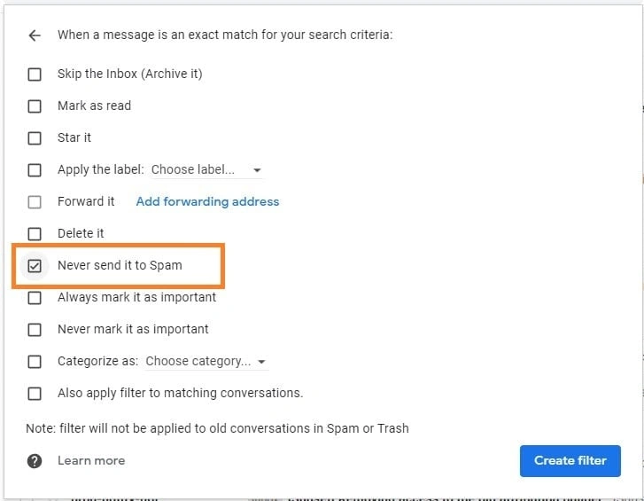 5. Check “Never send it to Spam” in the checkbox. Once you’ve clicked to create the filer, it will bring up a new window. You will then actually specify that you are whitelisting the domain or address by checking the “Never send it to spam” box.